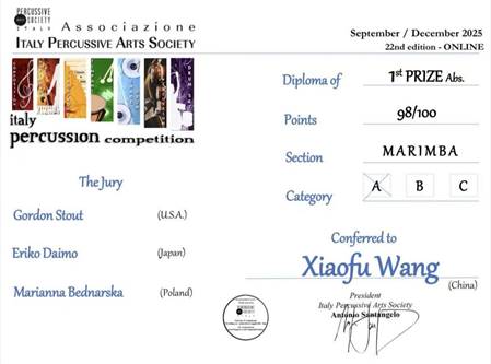 2025年12月荣获第二十二届意大利国际打击乐大赛马林巴A组第一名