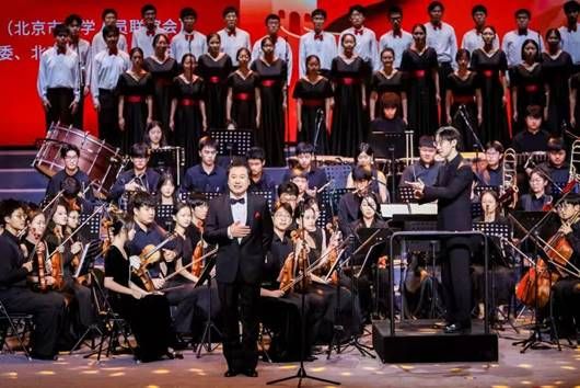 中央音乐学院少年交响乐团演奏,北京航空航天大学学生合唱团与现场观众齐唱《义勇军进行曲》。
