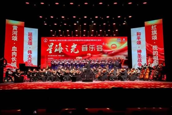 乐声流淌,歌声豪迈,交织出《在太行山上》《黄河颂》《保卫黄河》《义勇军进行曲》等经典抗战歌曲。乐声或苍劲抒情,或雄浑厚重,或热烈急促,或激昂强劲,再现中华民族在抗战岁月中万众一心、坚韧不屈的壮阔图景——“红日照遍了东方,自由之神在纵情歌唱”的自信,“敌人从哪里进攻,我们就要他在哪里灭亡!”的果敢,“我们祖国的英雄儿女,将要学习你的榜样,像你一样的伟大坚强!”的自强,“保卫家乡!保卫黄河!保卫华北!保卫全中国!”的壮烈,皆融入旋律之中。当全场观众起立齐唱国歌时,“冒着敌人的炮火,前进!前进!前进!进!” 更将现场氛围推向高潮。