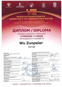 同期举办的第十五届全俄罗斯专业音乐学校(音乐学院附中)巴扬和手风琴比赛中,吴佐陪尔再度脱颖而出,摘得“初中组”第一名的桂冠。